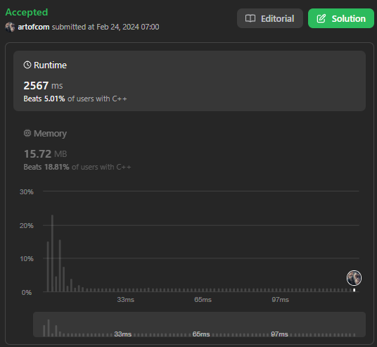 틀린 방법은 아니지만, 시간이 일반적인 풀이와는 동떨어 지게 나왔다.