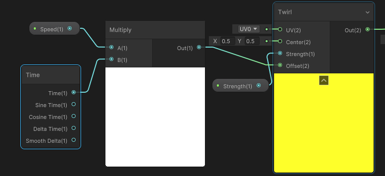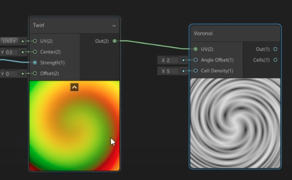 따라서 이 노드를 통해 휘몰아치는 유형의 2개의 float를 얻을 수 있고, 이를 주로 texture u, v coord로 사용한다.