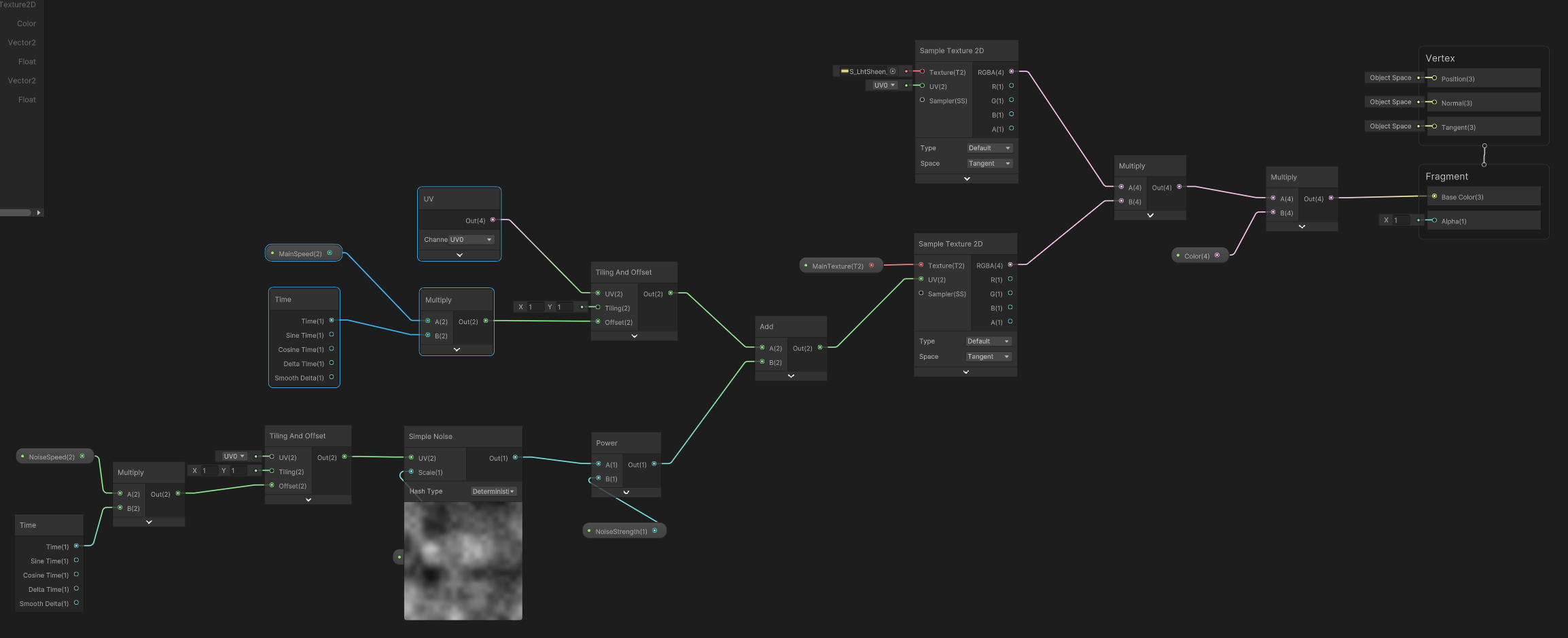 여기에 더 능동감 있는 빔 연출을 위해, noise 텍스쳐 맵을 섞고 time을 연결해 역시 비슷한 흐름을 만든다.