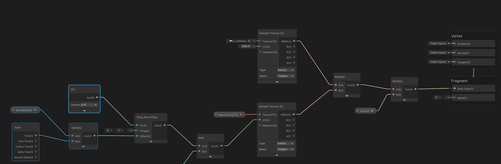 흐르는 효과를 위해 time과 tiling and offset node를 연결하고 이를 빔 텍스쳐에 반영한다.