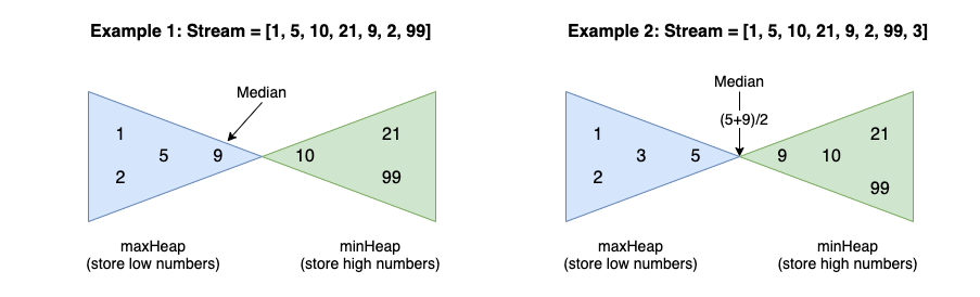 그렇다면 두 자루안의 수가 같으면 각 힙에서의 top 값이 바로 중간 값이 된다.