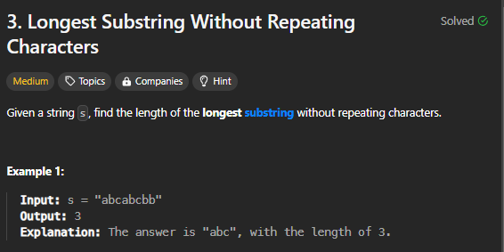 https://leetcode.com/problems/longest-substring-without-repeating-characters/description/