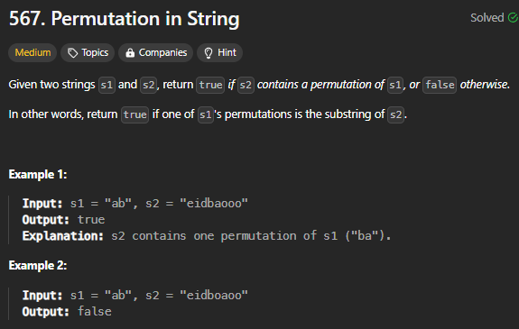 두개의 문장 s1과 s2가 주어질 때, s1의 permutation이 s2에 포함되어 있는지 여부를 반환하라.