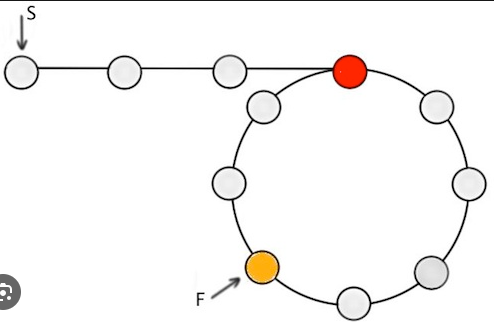 https://leetcode.com/problems/linked-list-cycle-ii/description Q. 주어진 Linked list 의 cycle의 시작점을 찾아 반환하라. 없으면 null을 반환하라. Solution 잘 알려진 linked list의 순환점을 찾는 문제이다. 우선 순환을 찾는 방법은 fast와 slow pointer를 운용하면서 두 포인터가 만나는 지점을 찾는 것이다. 이때 두 포인터가 만나는 부분은 head부터 cycle의 순환 시작점까지 거리를 k 라고 한다면 slow가 cycle 시작점에 위치 시, fast는 loop안에서 k 앞의 위치에 있다. 즉 현재 fast의 위치는 loop안에서 k, slow는 0 이라고 생각할 수 있다. head ---- slow --- f..