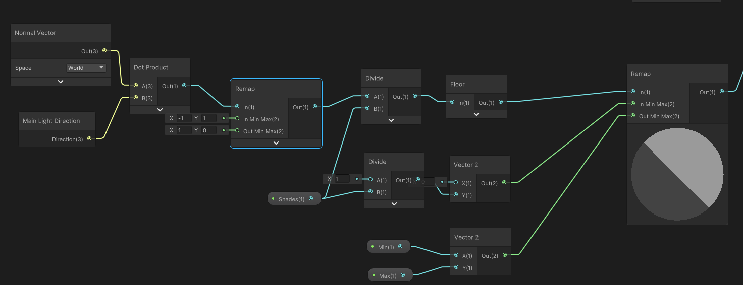 [SG] Toon Shader Graph https://www.youtube.com/watch?v=MXZ578OXOog 기본 아이디어는 기본 텍스쳐에 그라데이션을 겹치는 것이다. 어떻게 그라데이션을 만드는가, 기본적으로 빛 방향과 노멀 방향을 알아서 dot product 연산을 한다. 내적 연산 특성 상, 벡터 방향이 같으면 1, 90도 벌어지면 0, 그 뒤로는 음수값을 가진다. 이 특성을 이용한다. 그리고 쉐이딩 단계를 만들어야 하므로, 강제적으로 이 표현을 얻어내는 과정이 섞여 있다. 그라데이션을 내적에 의해 얻는 부분. 이 결과를 기존 텍스쳐와 결합한다. 결과. WannaFlySomeDay/UnityEngine - Shader 2024.04.03