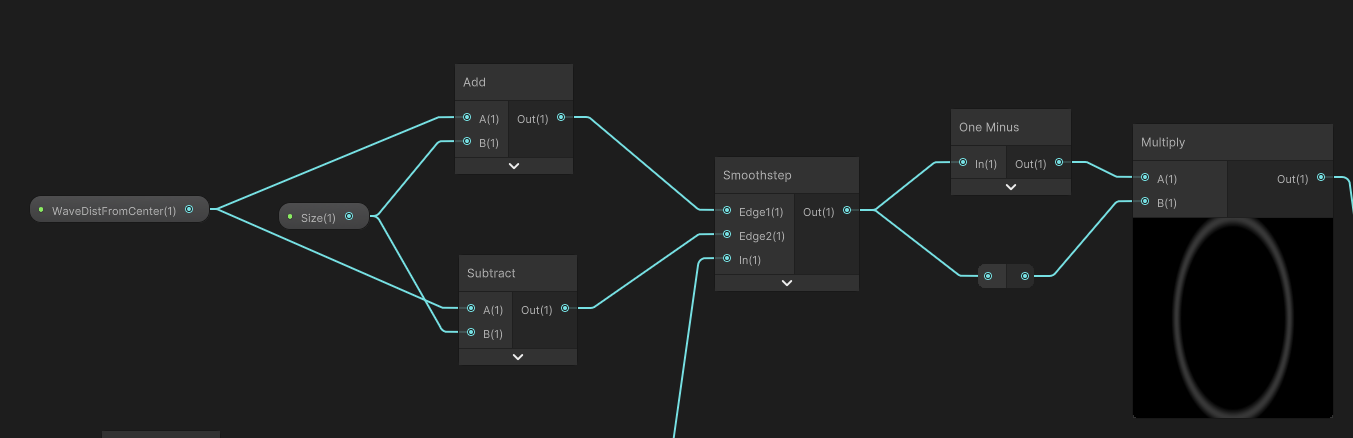 [SG] Shock Wave Effect SG https://www.youtube.com/watch?v=-spc1GJAtLY 기본 원리는 texture u, v 좌표를 원래 u, v 좌표에서 둥그런 모양으로 말아 올린 상태로 원이 커지도록 한다. 따라서 우선 원 모양 값이 부드럽게 만들어지도록 u, v 값을 세팅한다. center와 size값을 이용해서 차를 만들고 그 차를 부드럽게 하여 원 모양을 얻었다. 이에 원래 u, v 를 화면 위치, 비율 등을 감안하여 가공값을 찾는다. 이후 최종 그래프. 관련 material을 적용 후 최종 모습. WannaFlySomeDay/UnityEngine - Shader 2024.04.01
