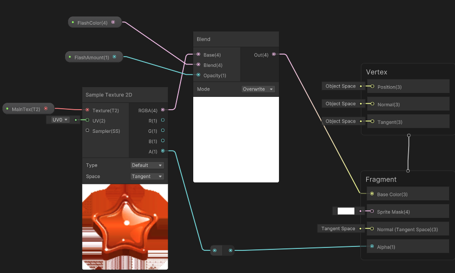 [SG] Damage Flash https://www.youtube.com/watch?v=rq6yGh-piIU 2D 게임에 아주 많이 나올 법한 쉐이더이다. 기본 아이디어는 원래 Main texture를 설정한 flash color와 섞는다. 이때, 강도, 대상 컬러 등을 외부 인자로 만든다. 상대적으로 간단 하지만, 사용도는 많을 수 있는 쉐이더. 전체 그래프. 결과. WannaFlySomeDay/UnityEngine - Shader 2024.04.02