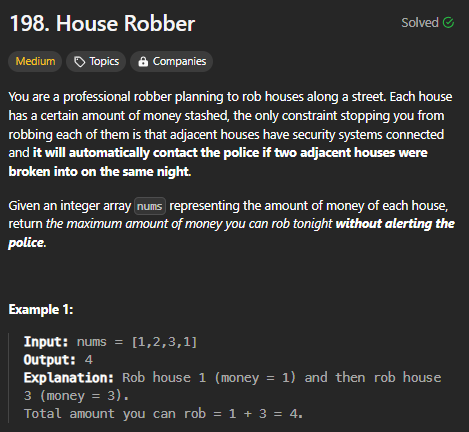 https://leetcode.com/problems/house-robber-ii/description/ 주어진 정수 배열을 각 집과 그 집에서 rob 할수 있는 value라고 한다. 이때 도둑은 인접해 있는 집은 털수가 없다. 또한 집들이 원형으로 연결되어 있다고 가정한다.따라서 마지막 집과 첫 집은 연결되어 있다. 도둑이 훔칠 수 있는 최대값을 찾아라. House Robber I 문제의 변형이다. 특정 위치에서 idx+2 혹은 idx+3에 접근 할 수 있다. 다만, 0에서 시작했으면 size()-1 까지만 접근 가능하다. 따라서 캐시 버퍼를 만들때 이 경우를 고려한다. 따라서 size() x 2의 캐시 사이즈가 필요하다. 또한 시작 시, 첫 집에서 시작 할 수 있고, 이때는 마지막 집은 접근 할 ..